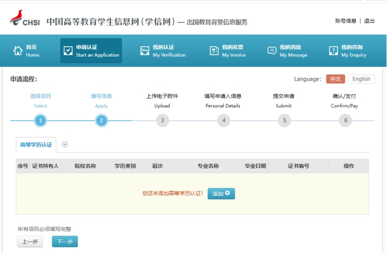 6、点击“添加”,进行个人学历、学位信息资料上传