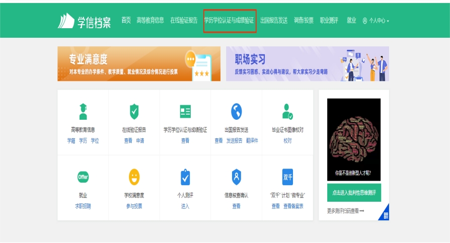 2、点击进入学信档案后,点击“学历学位认证与成绩验证”