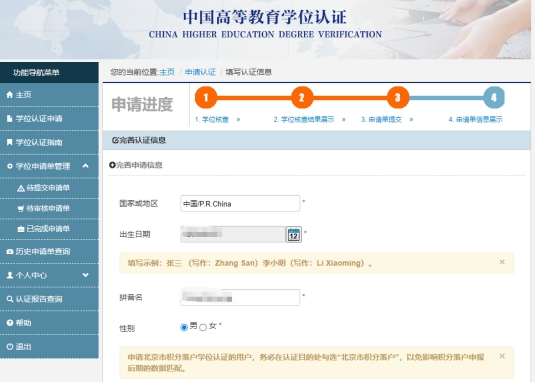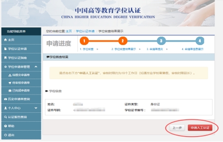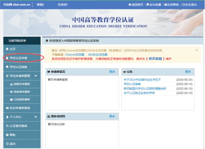 3、点击左侧“学位认证申请”