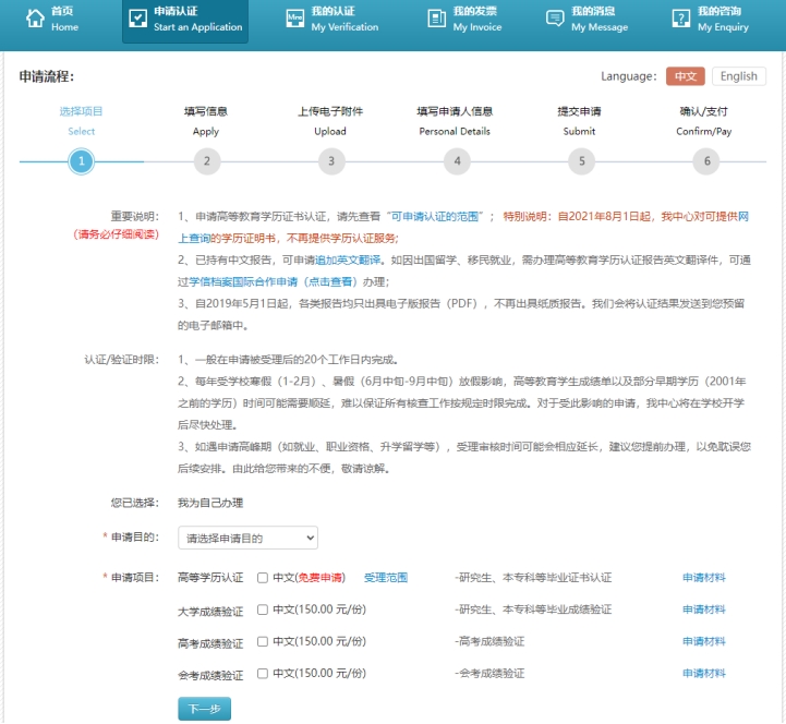 4、按照个人实际情况,选择“申请目的、申请项目”,点击“下一步”