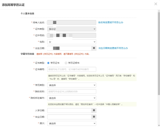 8、填写个人信息,并上传身份证正反面、毕业证、学位证照片。