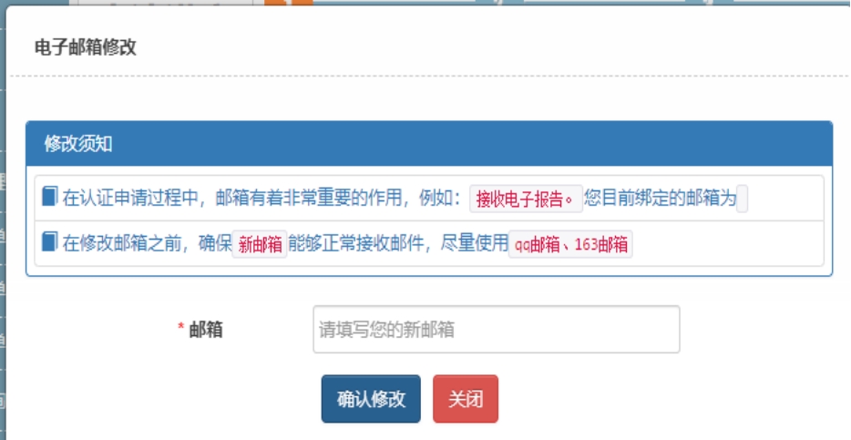 5、填写电子邮箱,用于接收电子认证报告,并点击确认修改。