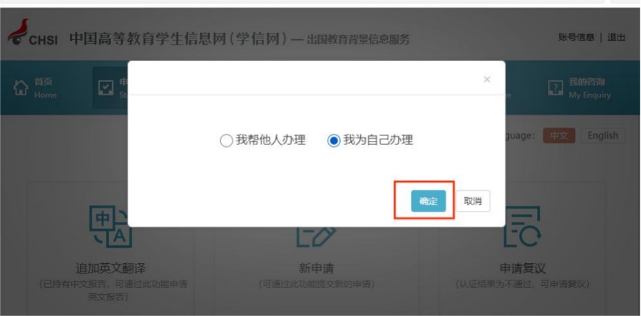 3、选择为自己办理,并点击确定。